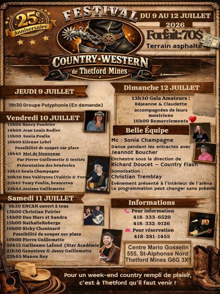Du 9 au 12 juillet 2026, venez vivre l’ambiance authentique du 25e anniversaire du Festival Country-Western de Thetford Mines. Pendant quatre jours, la musique country sera à l’honneur avec plusieurs artistes et musiciens talentueux.